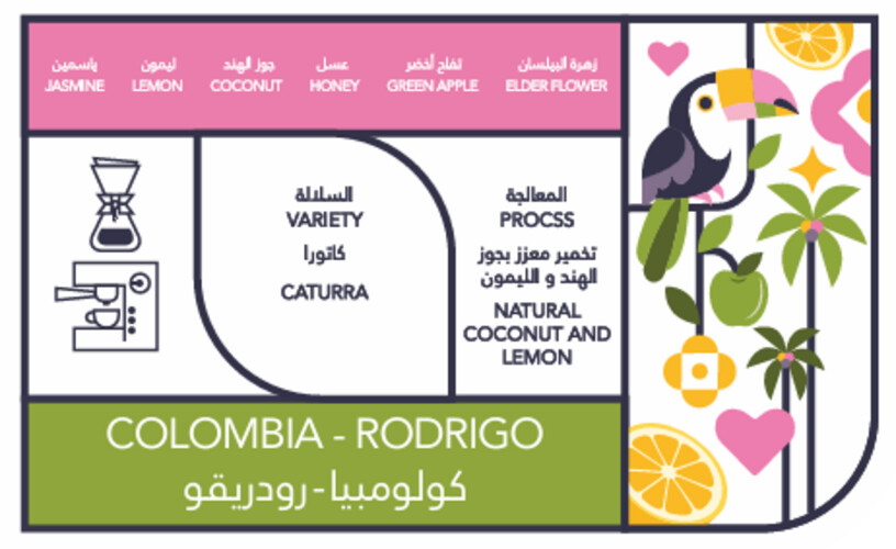 الإيحاءات: أناناس , غزل بنات , زهرة البيلسان , تفاح أخضر , عسل , جوز هند , ليمون , ياسمين المنشأ: كولومبيا السلالة: كاتورا المعالجة: تخمير طبيعي مع جوز الهند والليمون الوزن : 250 جرام