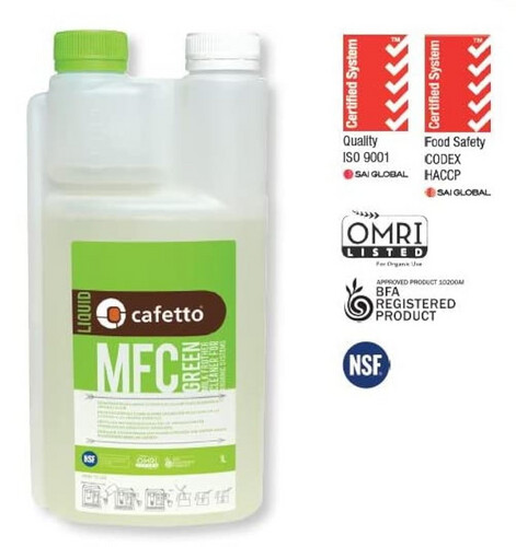 منظف للفروتر الحليب العضوي الحمضي. يحتوي MFC Green على منظفات قابلة للتحلل ومشتقة من الأحماض الطبيعية. يوفر إزالة ممتازة لدهون الحليب بالإضافة إلى إزالة الرواسب من الفروترات الأوتوماتيكية. كما أن MFC Green لا يترك أي أثر للرائحة بعد الشطف. يُوصى باستخدام MFC Green بشكل أكثر تكرارًا من المنظفات الأخرى نظرًا لخصائصه الأكثر اعتدالًا. آمن لجميع أجزاء الماكينة، ومدرج ضمن NSF.
